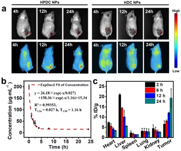 圖2. (a)4T1荷瘤(背部)BALB/c小鼠的熒光圖像注射HPDC NPs或HDC NPs后4、12和24小時(shí)(頂部和底部面板分別顯示亮場和熒光場圖像)。(b)濃度的變化靜脈注射HPDC NPs后小鼠外周血Cu含量的變化。(c)體內(nèi)注射HPDC NPs后2、6、12、24 h Cu的生物分布。